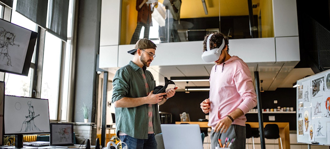 [Featured Image] Two VR developers use computer vision algorithms as they test their creations in a lab environment.